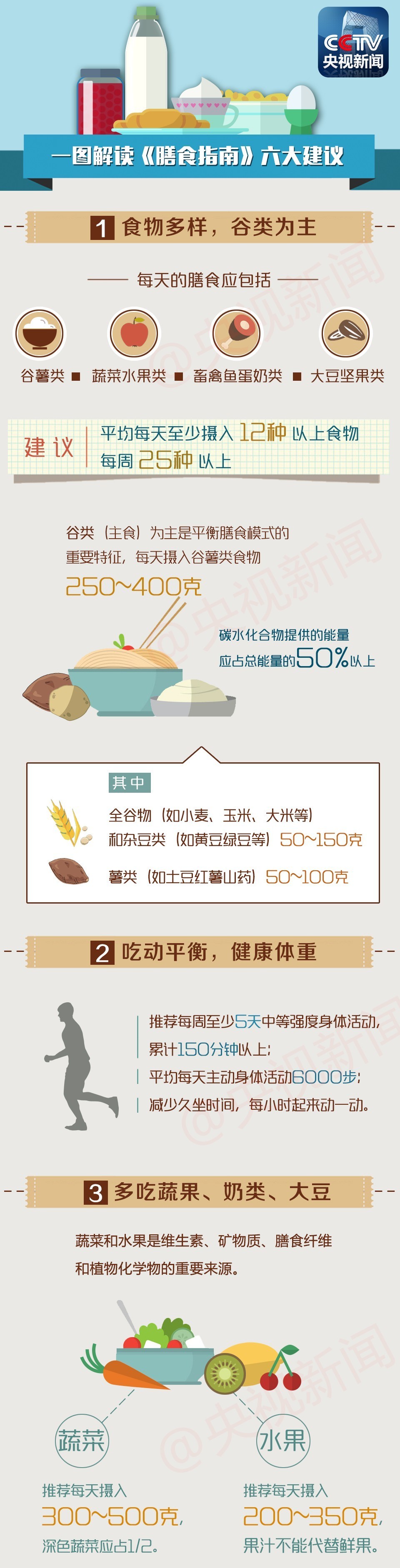 這本權(quán)威的“吃飯指南”歷時兩年半時間完成,既包括一般人群的膳食指南,也包括特定人群膳食指南(嬰幼兒、孕婦乳母、兒童青少年、老年人和素食人群)等,更加強調(diào)食物的多樣化與均衡,其中有六大核心推薦。